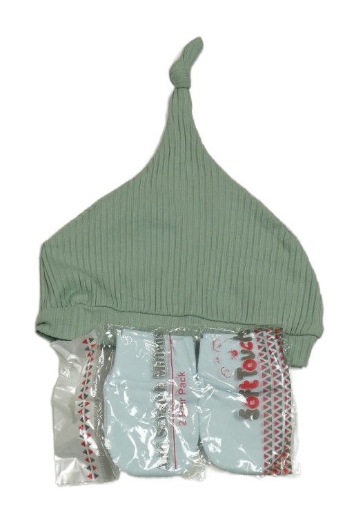3 set - zelená žebrovaná čepice + 2x světlemodré bavlněné rukavice