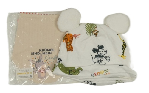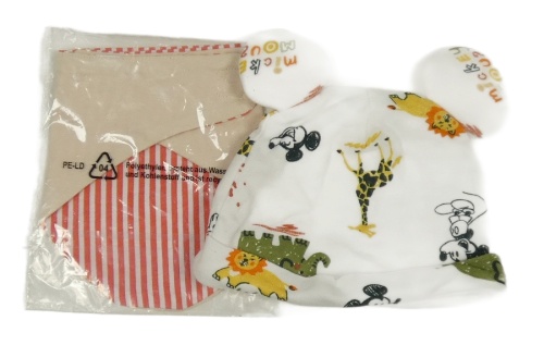 2 set - biela čapica so zvířaty + světlebéžový slinták s oslom