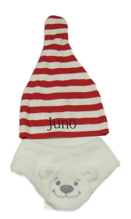 2 set - červeno-bílá pruhovaná čepice + smetanový slinták s medvěďom