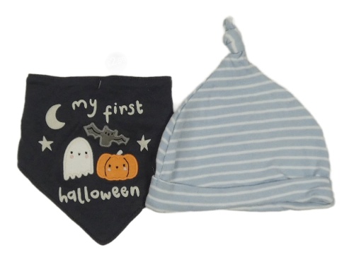 2set - Světlemodro-bílá pruhovaná čepice + Tmavošedý slinták s duchem a tekvicou