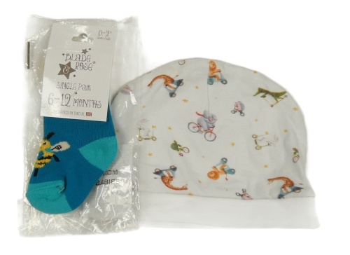 2set - Biela čapica so zvířaty + modré ponožky s včelou - nové