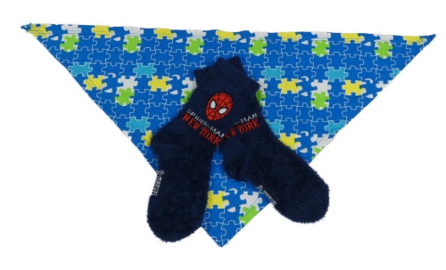 2 set - modrý vzorovaný šátek s puzzlemi + modré chlpaté ponožky so Spidermanem