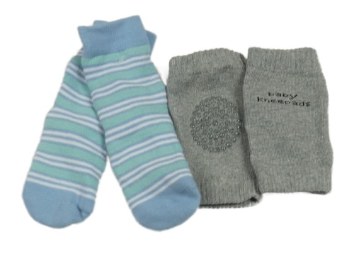 • 2Set - Modro/mentolovo/bílé pruhované teplé ponožky + šedé melírované návleky s nápismi a protiskluzem