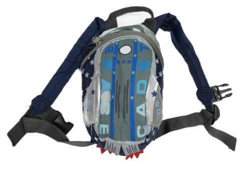 Šedo-tmavomodrý batůžek s nápisom a hviezdičkami