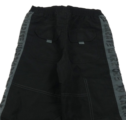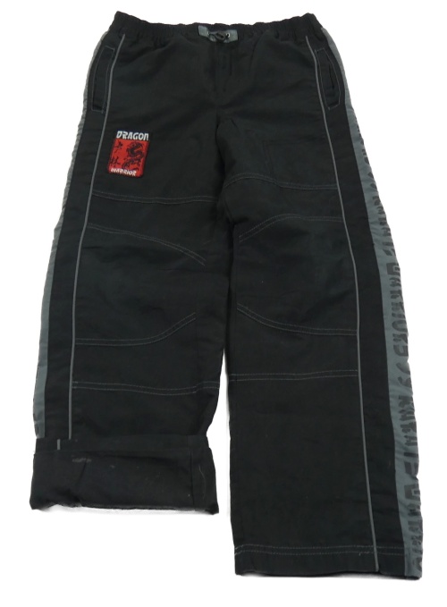 Čierno-tmavosivé šušťákové podšité nohavice s nášivkou a nápismi