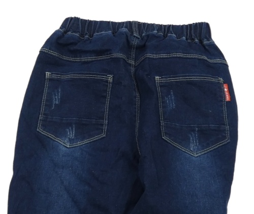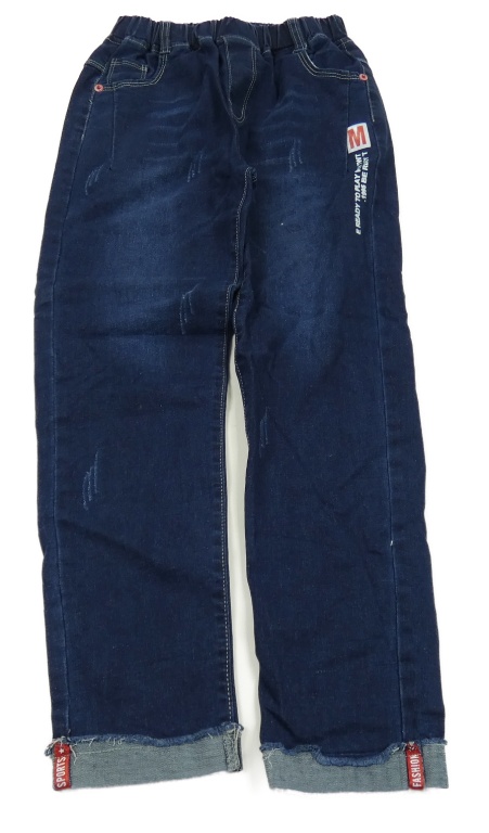 Tmavomodré rifle s nápismi a ošoupaného vzhledu