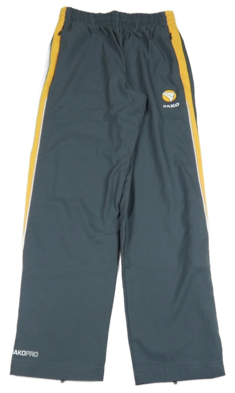 Sivé šušťákové nohavice so žltým pruhom a nášivkou jako