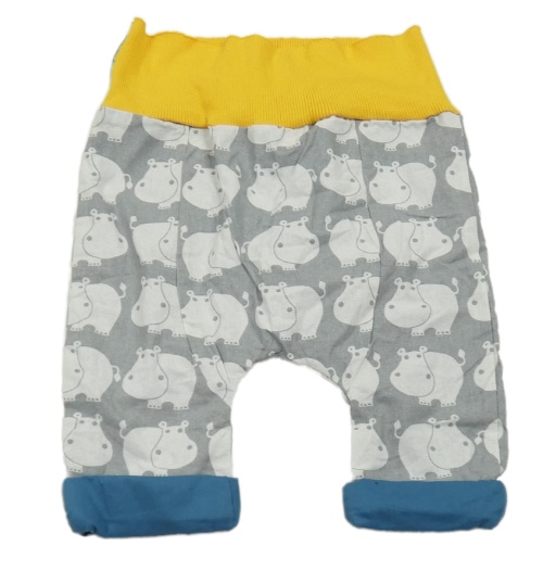 Sivé plátenné podšité nohavice s hrochy a barevnými lemy