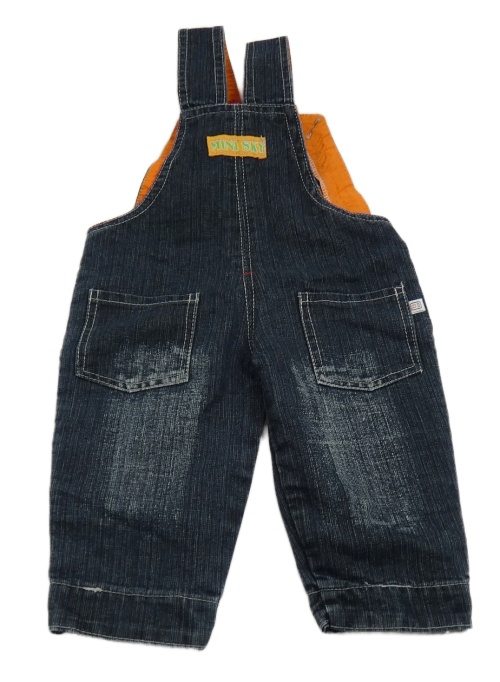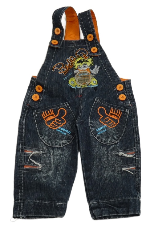 Tmavomodro-oranžové na traké rifle s nápismi a chlapcem