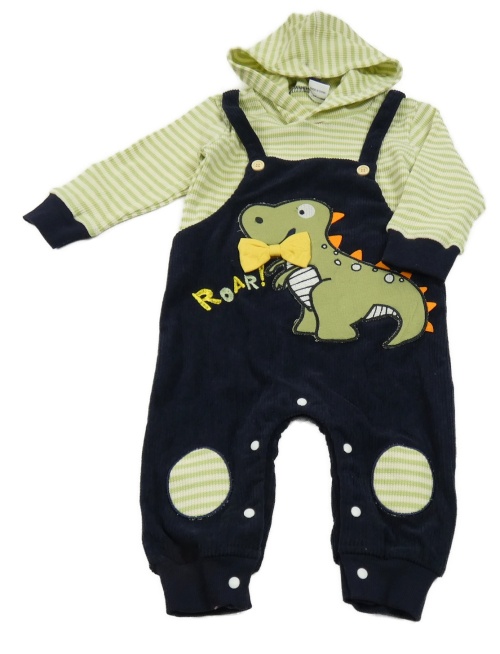 Tmavomodré rebrované na traké nohavice s dinosaurom a pruhovaným trikem s kapucňou