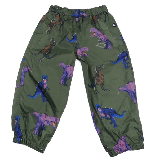 Khaki šušťákové nepromokavé nohavice s dinosaurami Joules