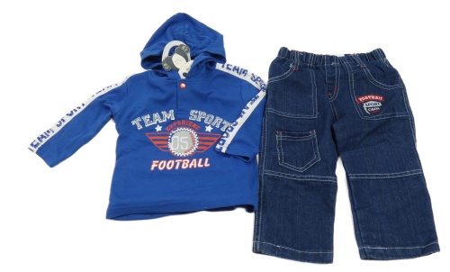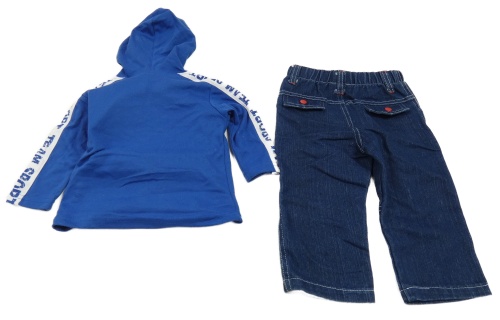 Nové - Tmavomodré rifle s nášivkou + modré tričko s potlačou a kapucňou