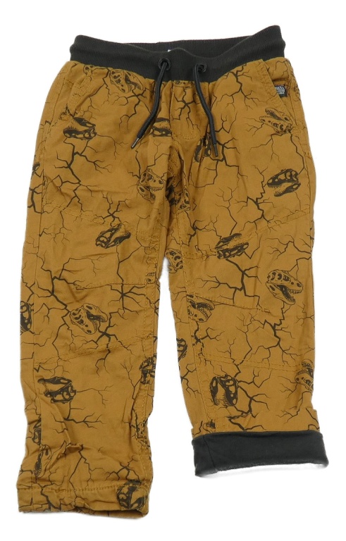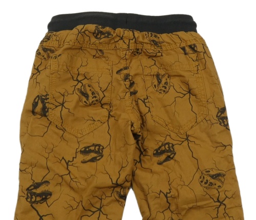 Hnedé vzorované plátenné podšité nohavice s lebkami dinosaurů a úpletovým pasom Dopodopo