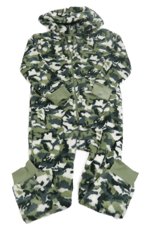 Kaki-sivo-biela vzorovaná chlpatá kombinéza s kapucňou