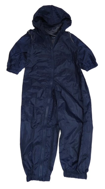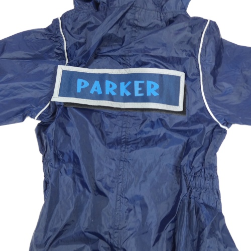 Tmavomodrá šušťáková nepromokavá kombinéza s nápisom a kapucňou