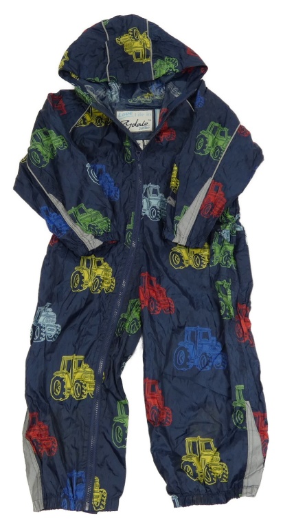 Tmavomodrá šušťáková nepromokavá kombinéza s farebnymi traktory a kapucňou Rydale