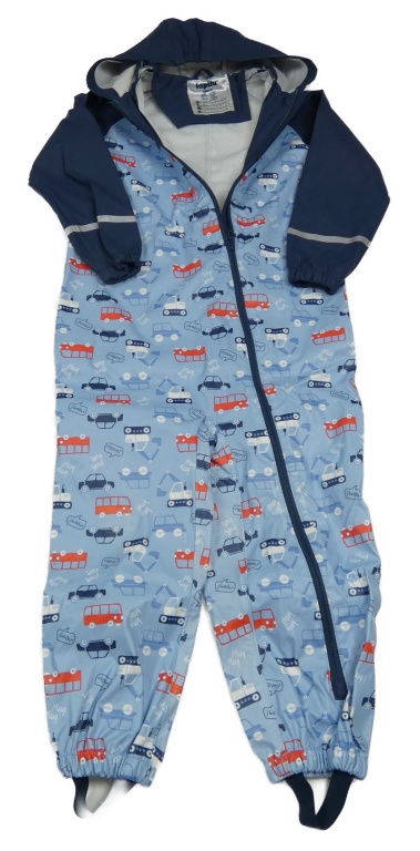 Modro-tmavomodrá nepromokavá kombinéza s autami a autobusmi a buldozery a kapucňou lupilu