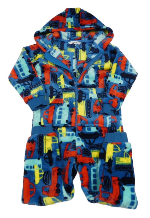 Tmavomodro-farebná plyšová kombinéza s autami a kapucňou