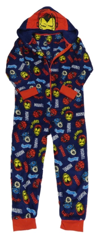 Tmavomodro-farebná chlpatá kombinéza s Marvel a kapucňou