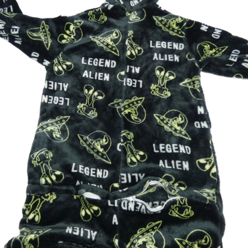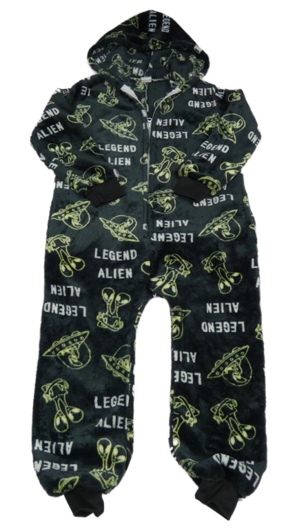 Čierna plyšová kombinéza s nápismi a ufem a kapucňou