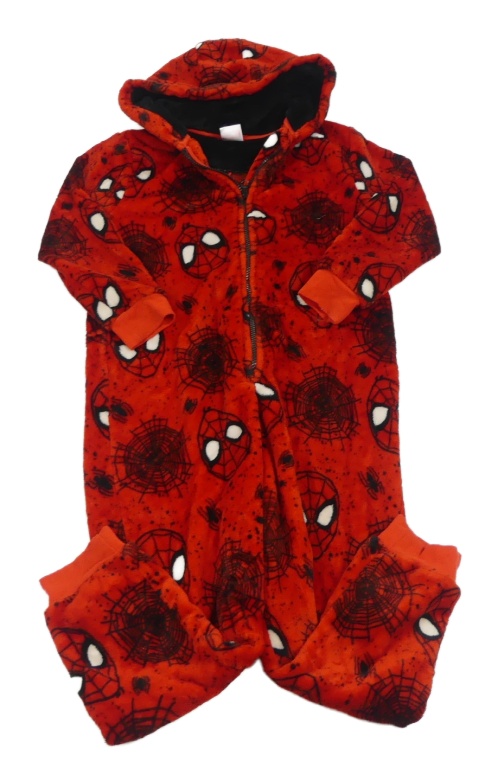 Červená chlpatá kombinéza so Spidermanem a kapucňou