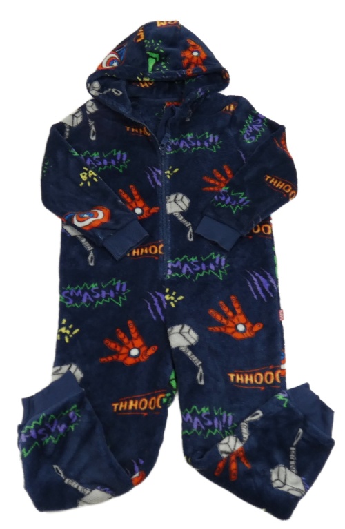 Tmavomodrá chlpatá kombinéza s hrdinami a kapucňou