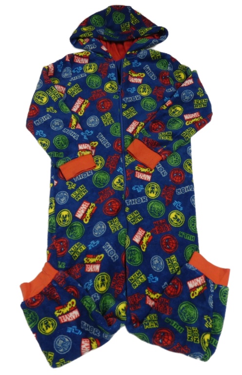 Modrá chlpatá kombinéza s logy Avengers a kapucňou Marvel