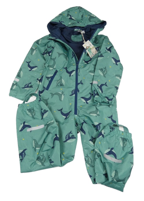 Nové - Mátová šušťáková podšitá kombinéza s velrybami a kapucňou Lily&Dan