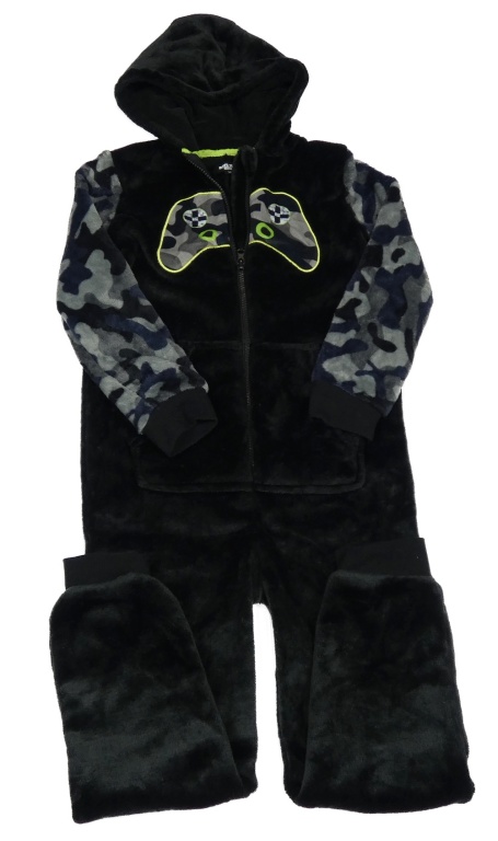 Čierno-sivá plyšová kombinéza s ovladačem a kapucňou