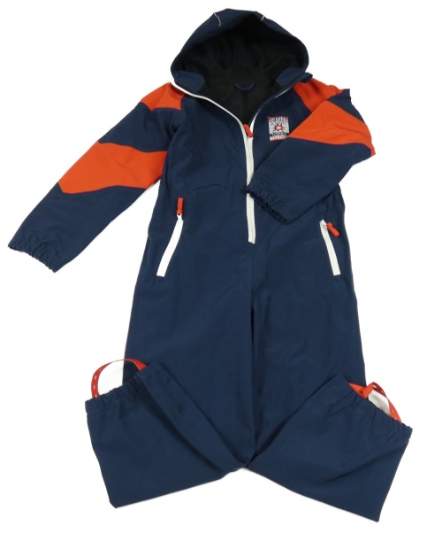 Tmavomodro-červená šušťáková kombinéza s nášivkou a kapucňou