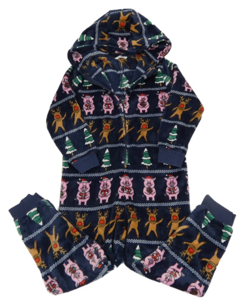 Tmavomodro-farebná chlpatá kombinéza s prasaty, sobmi a kapucňou M&S
