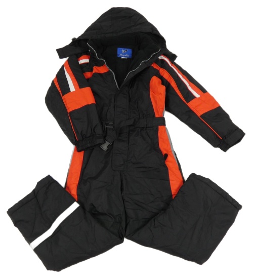 Čierno-červeno-biela šušťáková zimná kombinéza s pruhmi a kapucňou