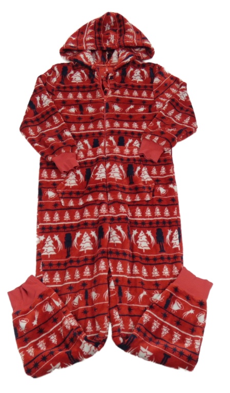 Červená vzorovaná chlpatá kombinéza so stromky a kapucňou ThreadBare