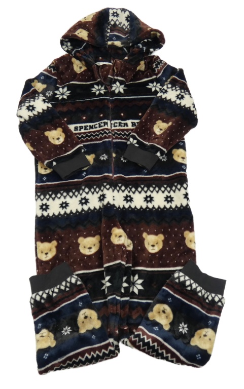 Tmavomodro-hnedá vzorovaná chlpatá kombinéza s medveďmi a kapucňou M&S