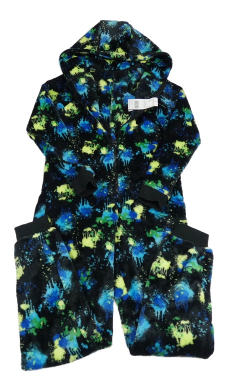 Nové - Čierno-modro-žlto-zelená plyšová kombinéza s fleky a kapucňou F&F