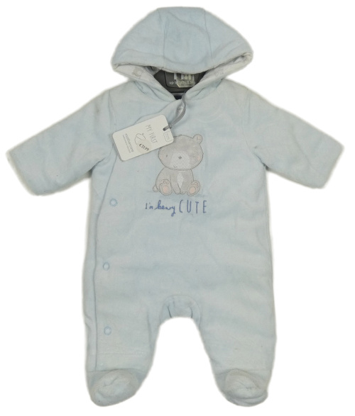 Nové - Svetlomodrá zamatová zateplená kombinéza s medvěďom a kapucňou Mothercare