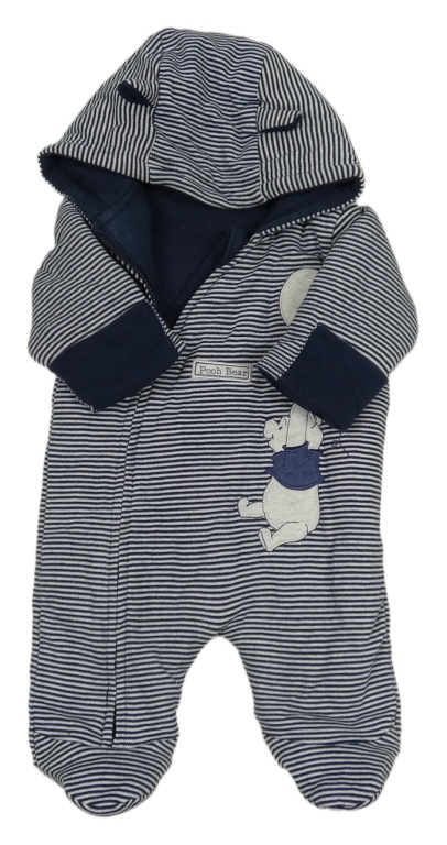 Bielo-tmavomodrá pruhovaná tepláková zateplená kombinéza s Medvídkem Pú a kapucňou George