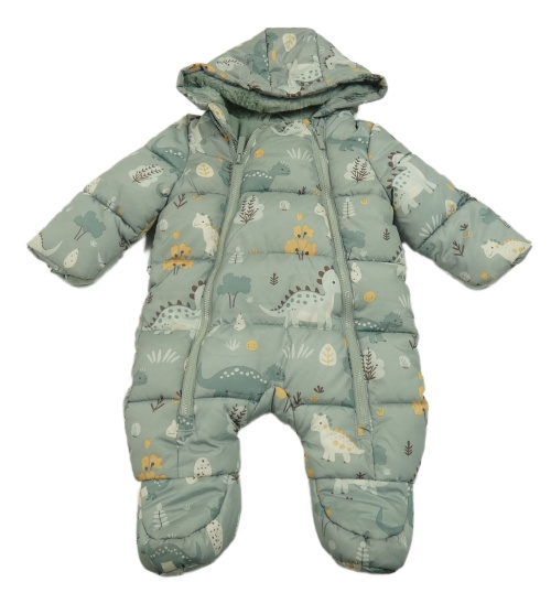 Světlekhaki prešívaná šušťáková zimná kombinéza s dinosaurami a kapucňou PRIMARK