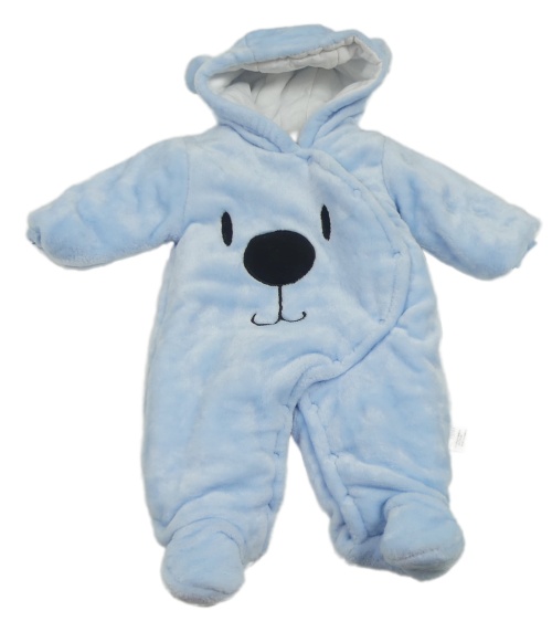 Svetlomodrá chlpatá zateplená kombinéza s ňufáčikom a kapucňou