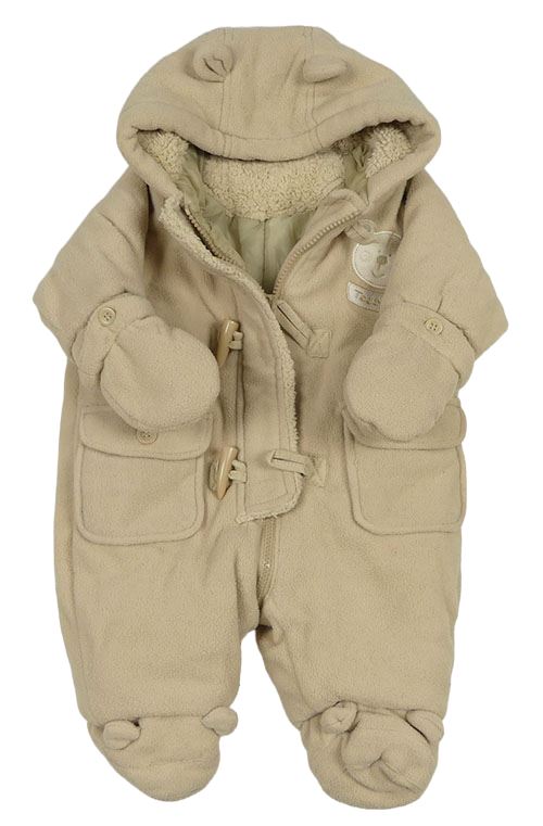 Béžová fleecová zateplená kombinéza s medvěďom a kapucí + rukavice Ladybird