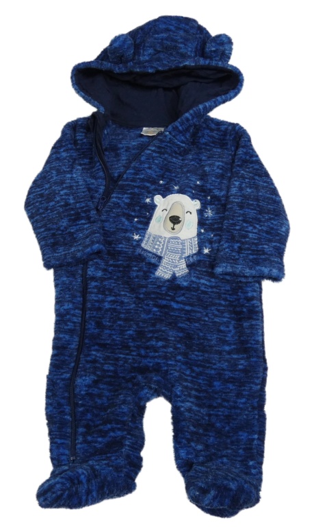 Tmavomodro-čierna melírovaná plyšová kombinéza s medvěďom a kapucňou