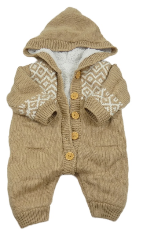 Hnedo-biela vzorovaná pletená zateplená kombinéza s kapucňou