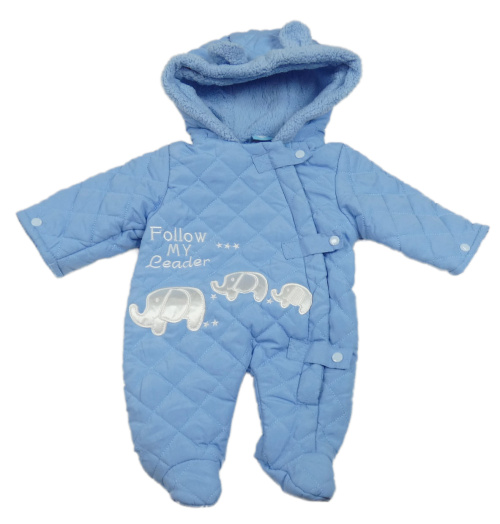 Modrá šušťáková prešívaná zimná kombinéza so slonmi a kapucňou