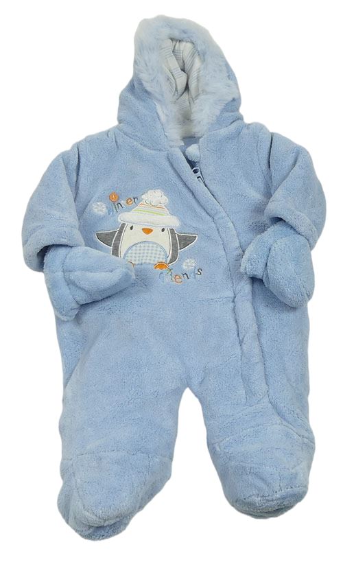 Svetlomodrá chlpatá zateplená kombinéza s tučňáčkem a kapucňou s kožešinou + rukavice F&F