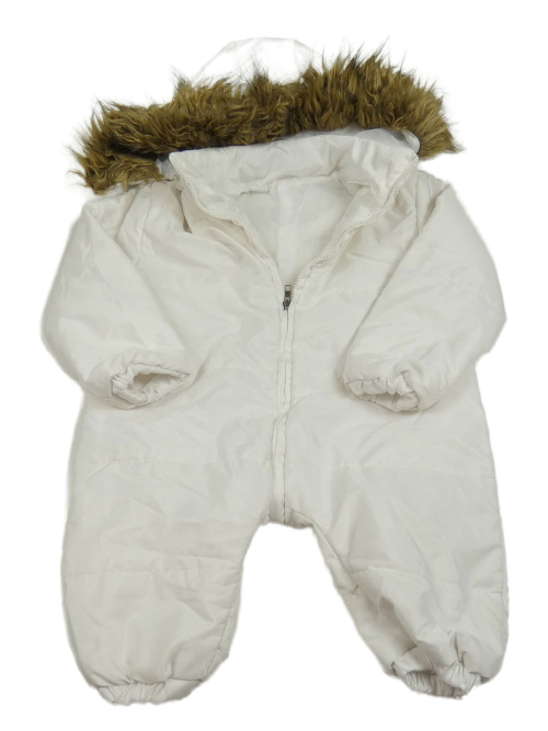 Biela šušťáková zateplená kombinéza s kožešinou na kapuci