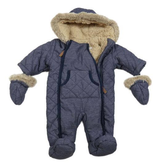 Tmavomodrá melírovaná prešívaná šušťáková zimná kombinéza s kapucí + rukavice Miniclub