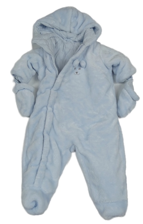 Svetlomodrá plyšová zateplená kombinéza s medvěďom a kapucí + rukavice