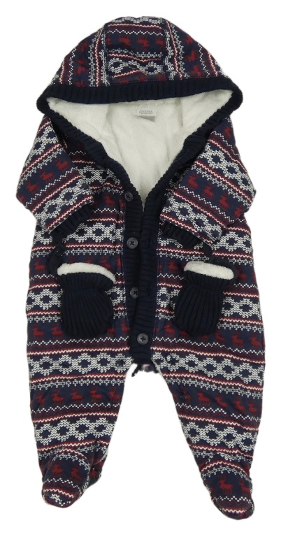 Tmavomodro-bielo-vínová vzorovaná zateplená kombinéza s kapucí + rukavice Mamas&Papas
