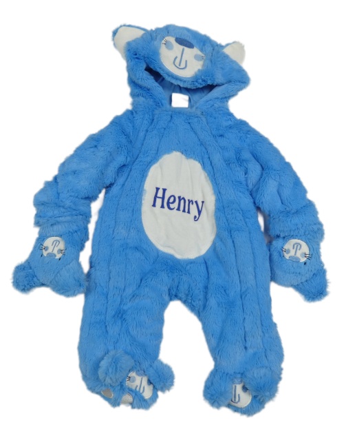 Modrá kožušinová zateplená kombinéza s kapucí - medvěď