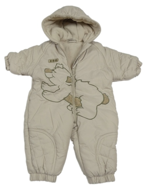 Béžová šušťáková zimná kombinéza s medvěďom a kapucňou
